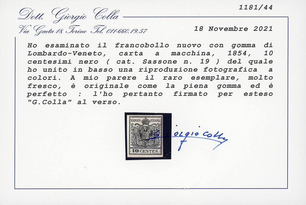 1857 - 10 cent. nero, carta a macchina (19), gomma originale, perfetto. Bello e raro! Sorani, cert. Colla.