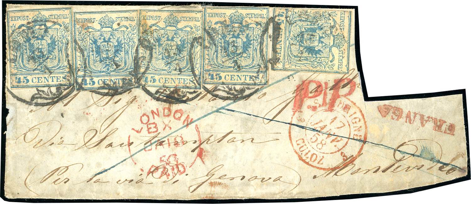 1858 - 45 cent. azzurro, carta a macchina (22), cinque esemplari ritagliati lilliput lungo i margini, su gran parte di frontespizio di lettera da Como 13/1/1858 a Montevideo, Uruguay. Rarissima destinazione di Lombardo Veneto, uno dei tre casi noti. Ex coll. Imperato.