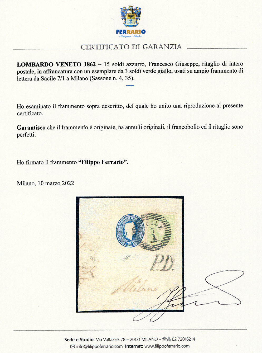 1862 - 15 soldi azzurro Francesco Giuseppe, ritaglio di intero postale (4), in affrancatura con 3 soldi verde giallo (35), perfetti, su ampio frammento di lettera da Sacile 7/1 a Milano. Bellissimo e raro. Ferrario.