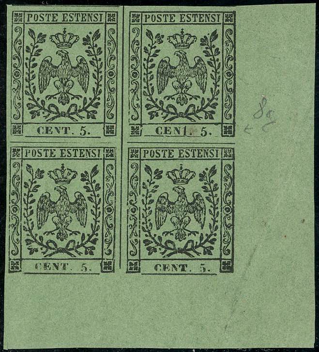 1855 - 5 cent. verde oliva, blocco di quattro, angolo di foglio, un esemplare con varietà "CEN1" (8g,8), gomma integra, perfetto. Bello e raro.