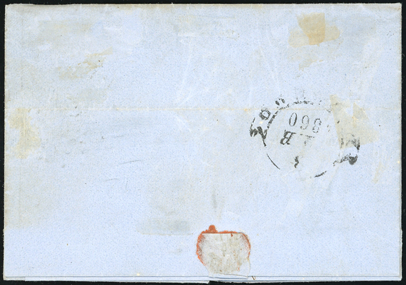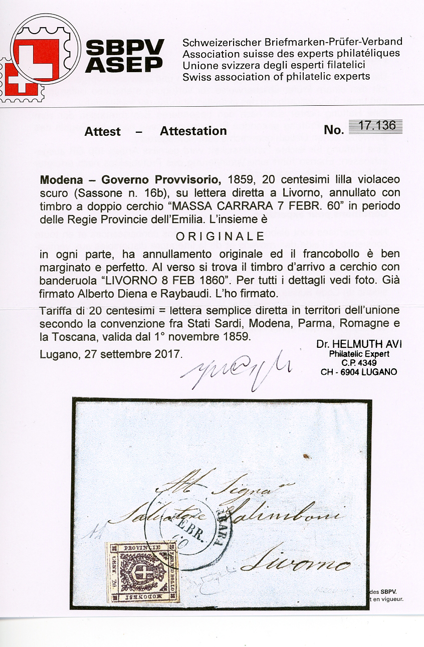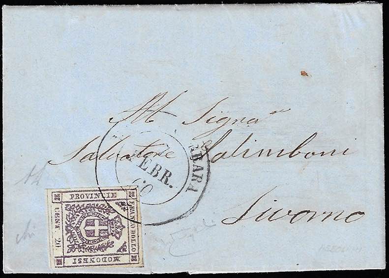 1860 - 20 cent. lilla violaceo scuro (16b), perfetto, su lettera da Massa Carrara 7/2/1860, in periodo di Regie Provincie dell'Emilia, a Livorno. Rara! A.Diena, Raybaudi, cert. Avi.