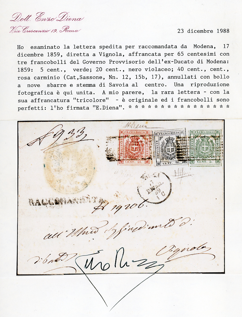 1859 - 40 cent. rosa carminio, 5 cent. verde, 20 cent. nero violaceo (17,12,15b), perfetti con ampi margini, su lettera raccomandata da Modena 17/12/1859 a Vignola. Spettacolare e rara affrancatura tricolore. Bellissima. A.Diena, G.Oliva, cert. E.Diena.