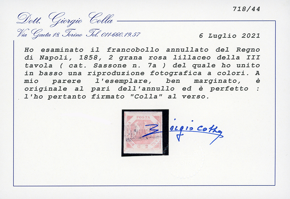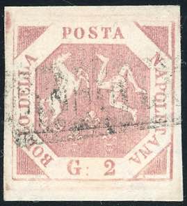 1858 - 2 grana rosa lillaceo, III tavola (7a), usato, perfetto e molto fresco. Rara tonalità di ottima qualità. Cert. Colla.