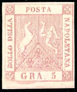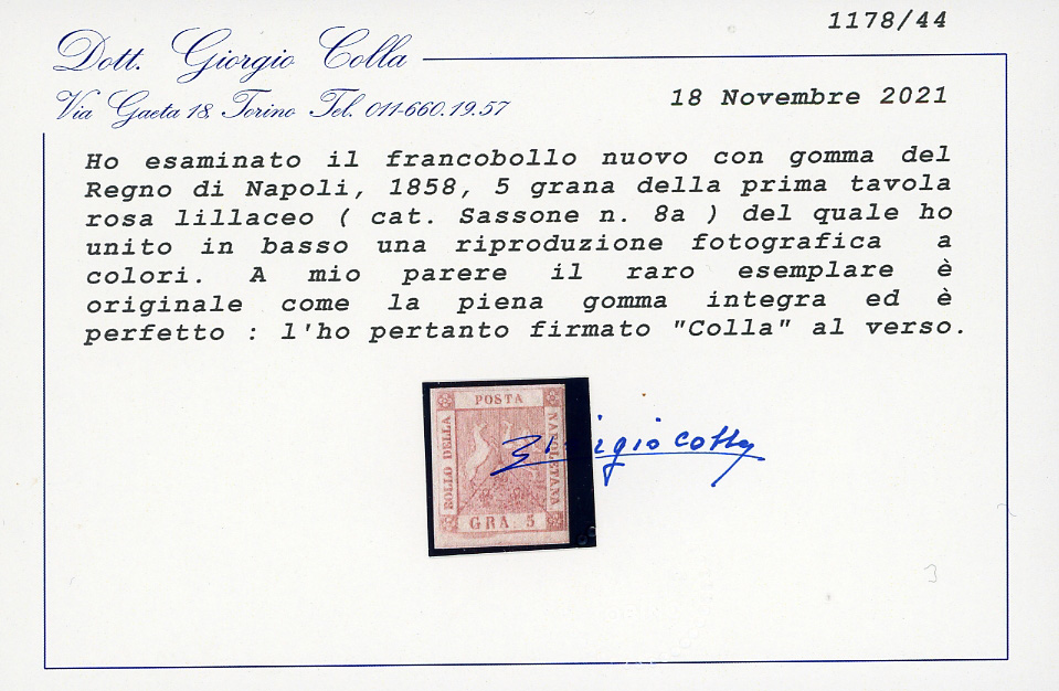 1858 - 5 grana rosa lillaceo, I tavola (8a), gomma originale integra, perfetto. Raybaudi, cert. Colla.