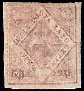 1859 - 20 grana rosa lillaceo, I tavola (12a), gomma originale, ottimo stato. Cert. R.Diena.