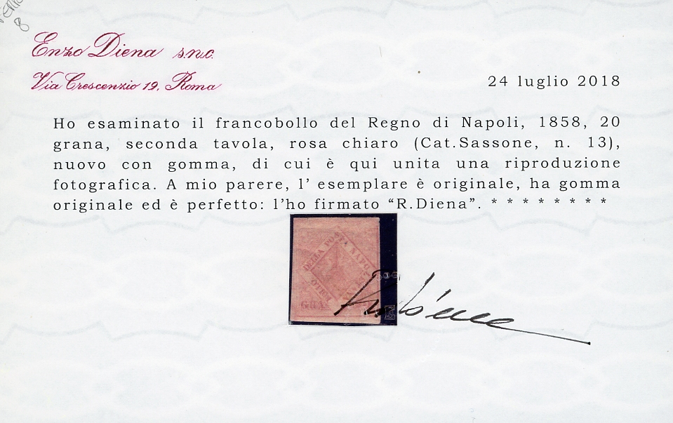 1859 - 20 grana rosa chiaro, II tavola (13), nuovo, gomma originale, perfetto. Molto fresco e ben marginato. Raro! Ferrario, Cert. Diena.