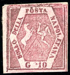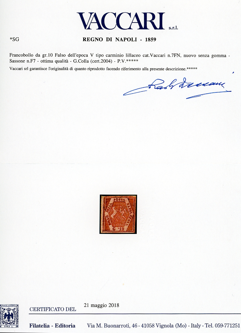 1859 - 10 grana carminio lillaceo, falso per posta (F7), nuovo senza gomma, perfetto. Freschissimo e molto raro. Cert. Colla e Vaccari.