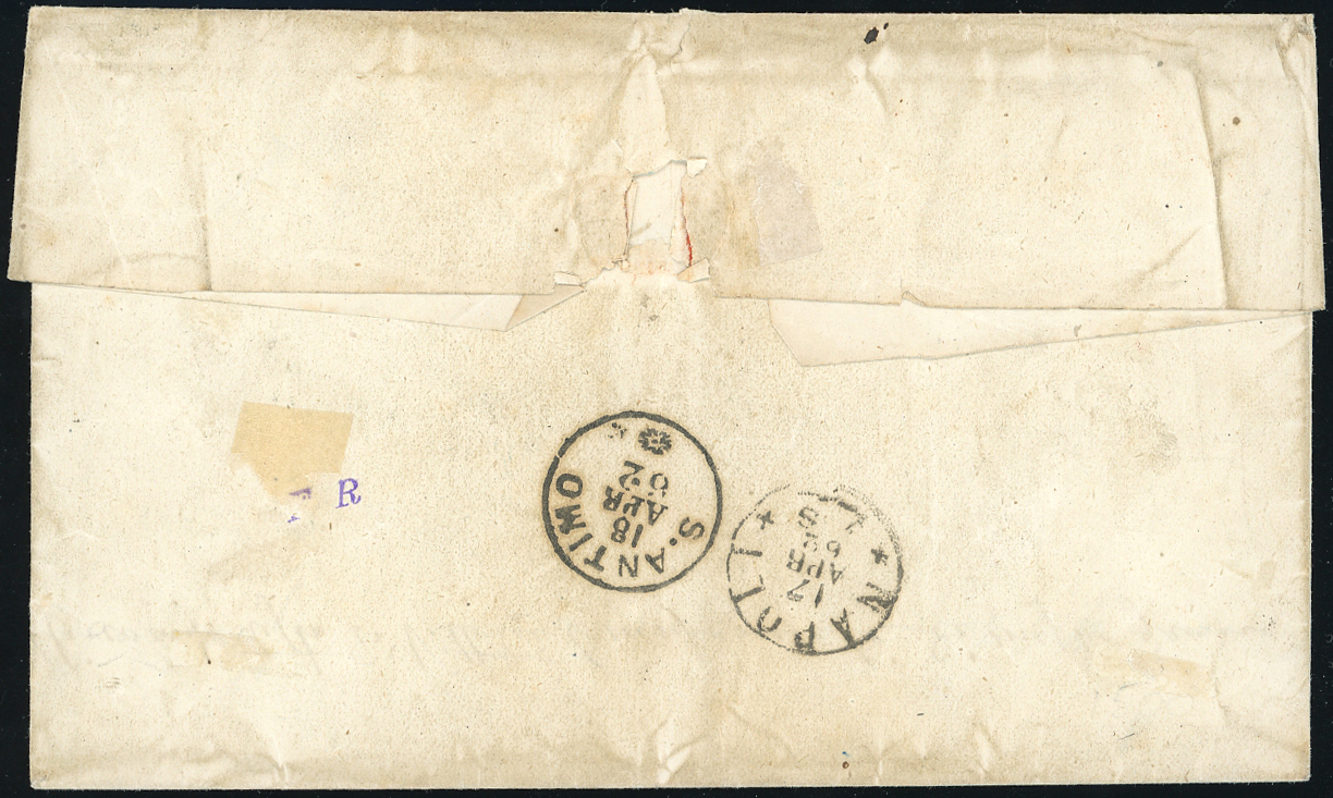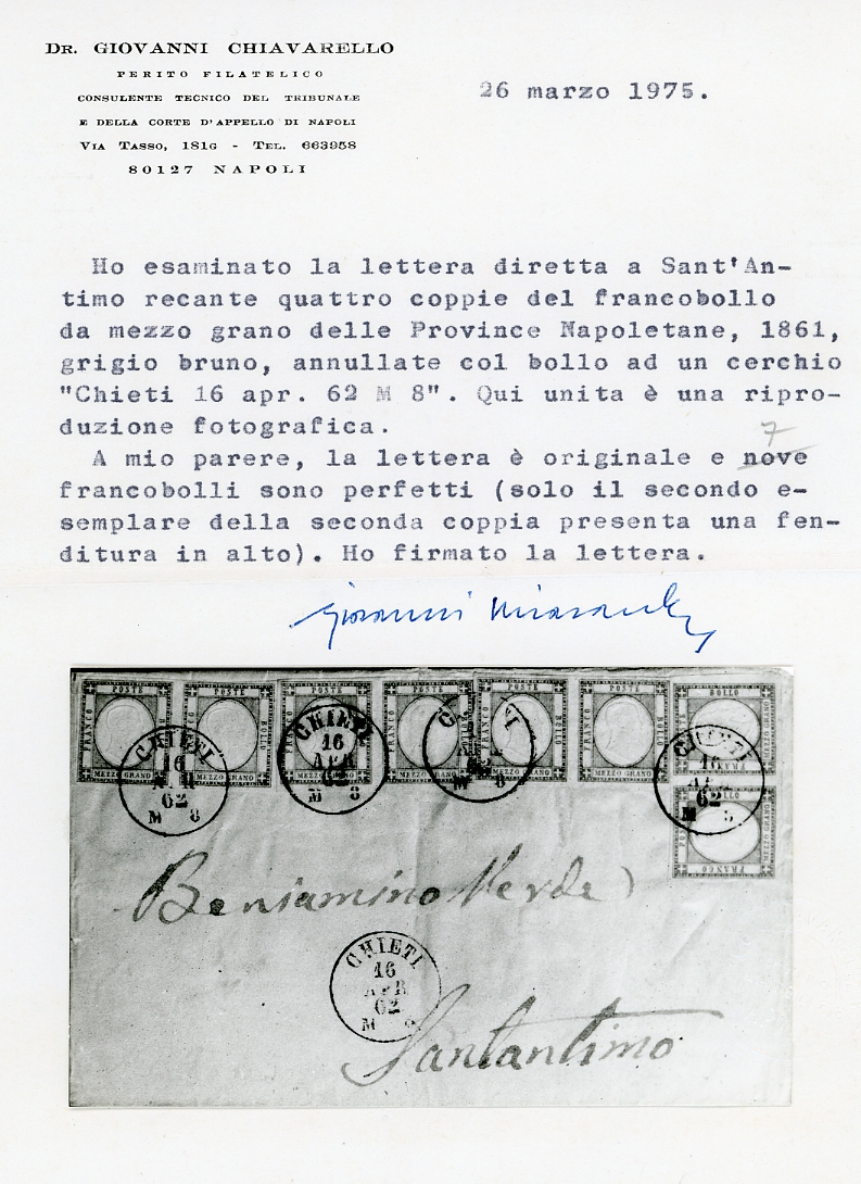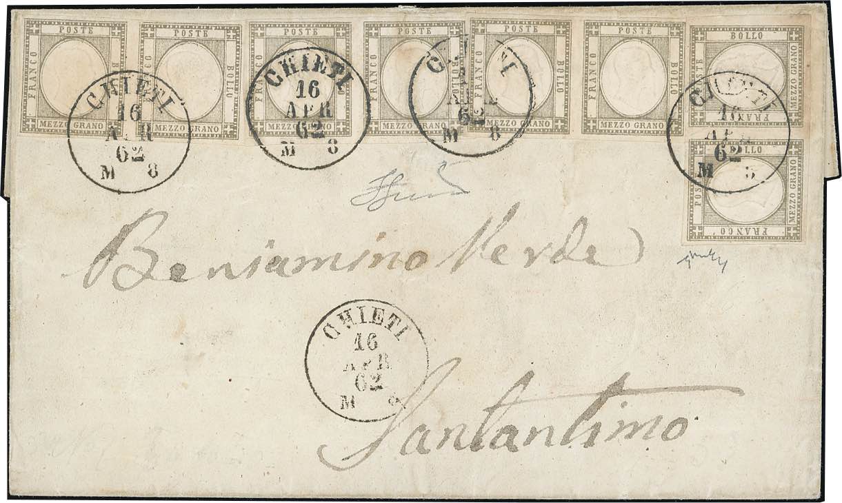 1862 - 1/2 grano grigio bruno (18a), quattro coppie orizzontali perfette, tranne un esemplare con ininfluente difetto in alto, su fresca sovracoperta di lettera da Chieti 16/4/1862 a S.Antimo, bolli d'arrivo. Eccezionale affrancatura multipla monovalore, probabilmente il massimo multiplo noto di questa tinta. Rarità. Stima di catalogo astronomica. Cert. Chiavarello, Ferrario.