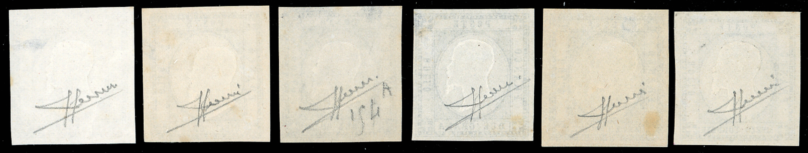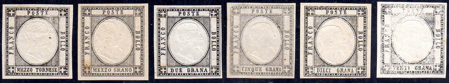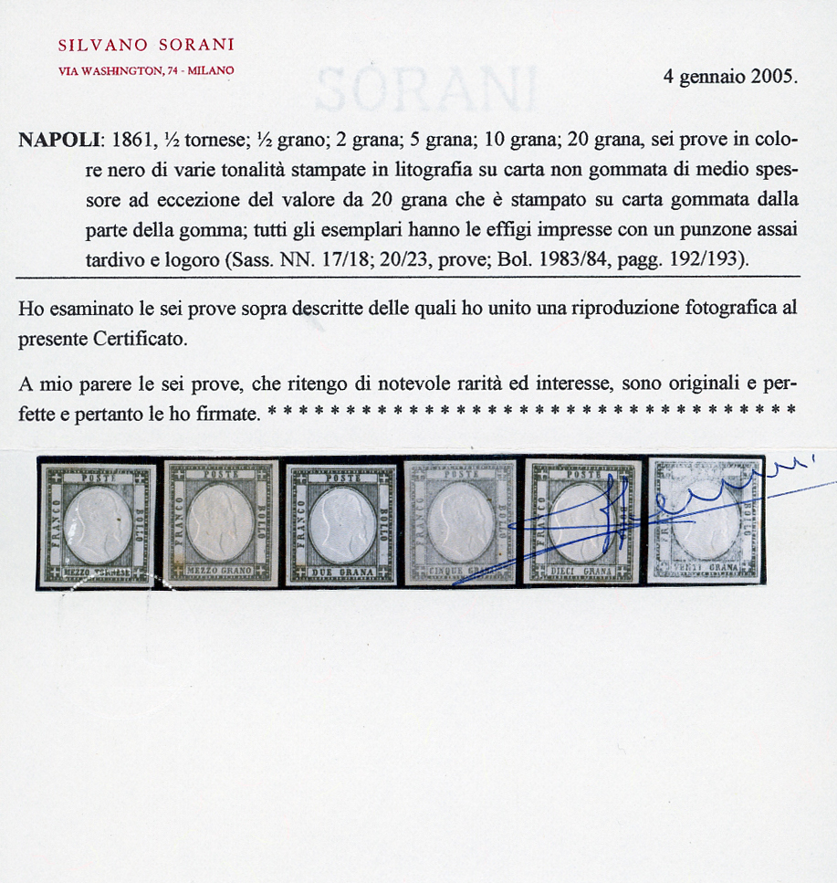 SAGGI 1861 - 1/2 tornese, 1/2 grano, 2 grana, 5 grana, 10 grana, 20 grana, prove in colore nero, varie tonalità, stampate in litografia su carta non gommata, ad eccezione del 20 grana stampato su carta gommata dalla parte della gomma, perfette. Insieme molto raro! Cert. Sorani.