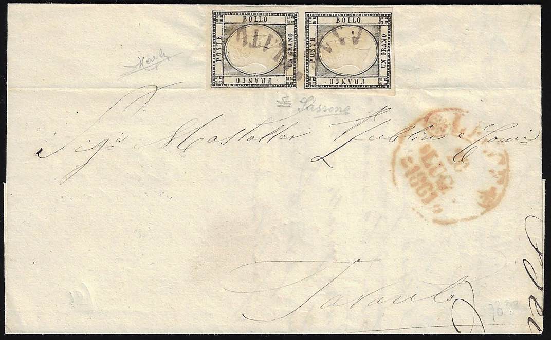 LECCE, svolazzo + cerchio rosso punti 8 - 1 grano (19), coppia, perfetta, su lettera del 20/7/1861 per Taranto. Raybaudi, Sassone.