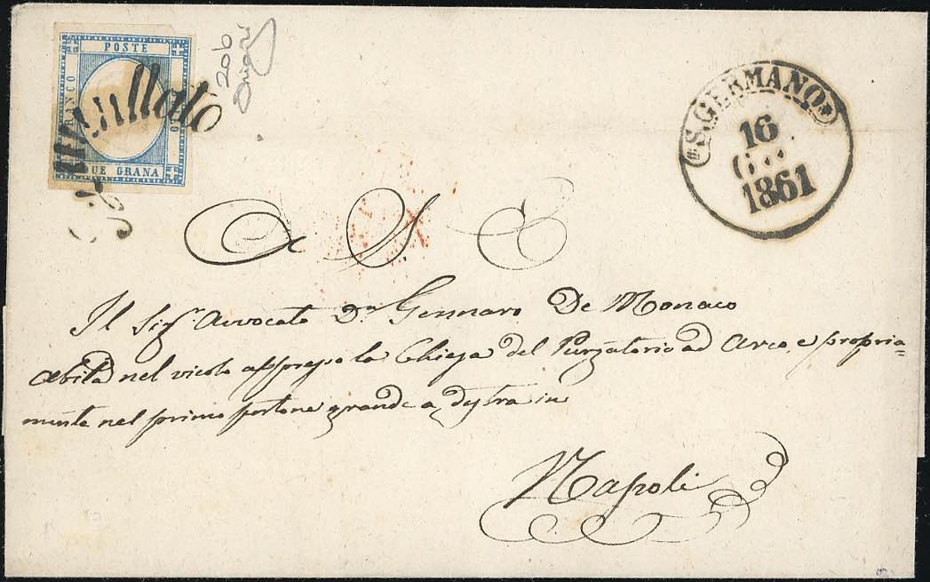 S.GERMANO, svolazzo + cerchio punti 13 - 2 grana (20), lieve piega orizzontale, su sovracoperta di lettera del 16/6/1861 per Napoli. Raro annullo, molto nitido. Cert. Raybaudi.