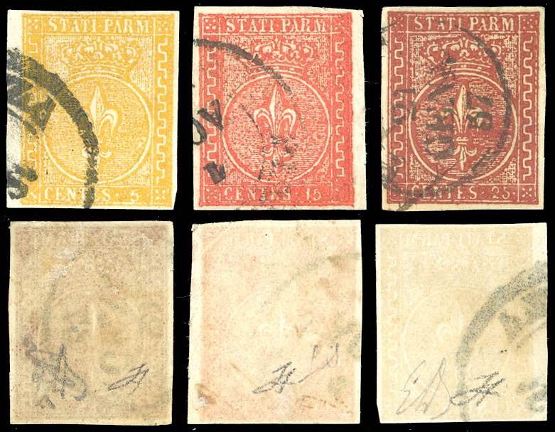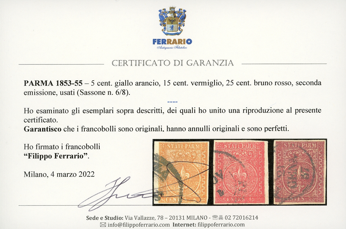1853/55 - Seconda emissione (6/8), usati, perfetti. Belli, Em.Diena, cert. Ferrario.