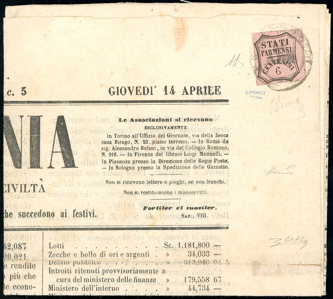 1859 - 6 cent. rosa vivo (1), perfetto e ben marginato, su giornale L'Armonia del 14/4/1859 annullato in arrivo a Pontremoli. Molto raro. Em. ed A.Diena, Ferrario, cert. Colla.