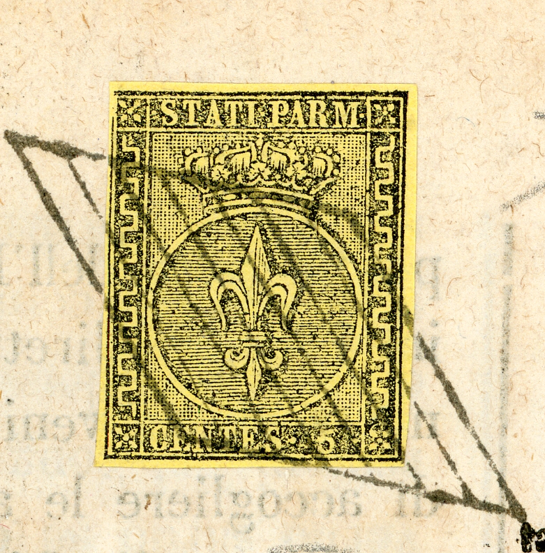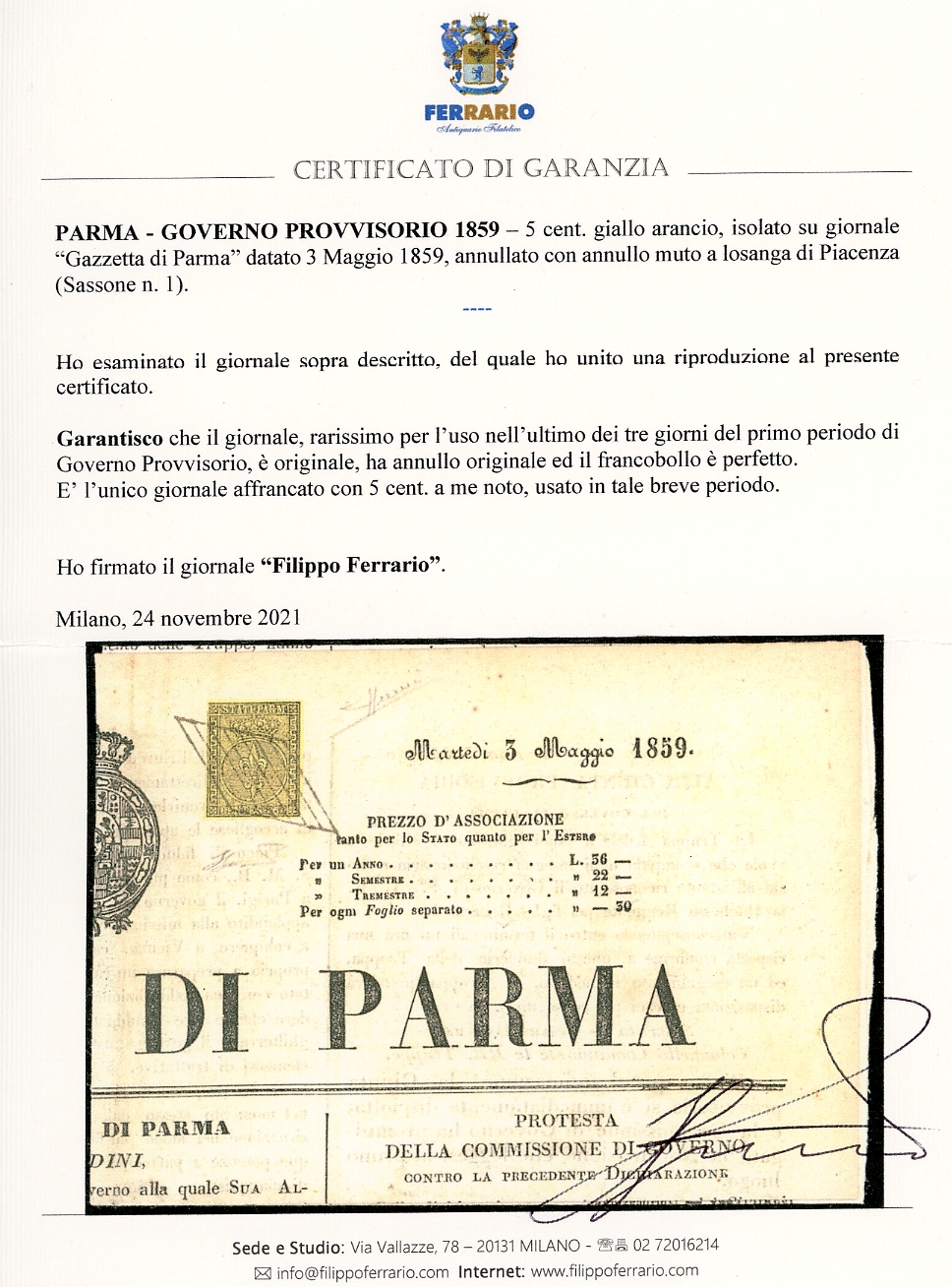 1859 - 5 cent. giallo arancio (1), perfetto, isolato su giornale "Gazzetta di Parma" del 3/5/1859 annullato con il muto a losanga di Piacenza. Eccezionale ed unico uso nell'ultimo dei tre giorni del primo periodo di Governo Provvisorio. Grande rarità del periodo risorgimentale. Cert. Sorani e Ferrario.