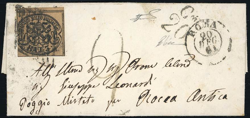 1861 - 3 baj bruno (4Aa), buono stato, isolato su lettera da Roma 20/12/1861 a Poggio Mirteto, tassata 2 a penna e con bollo di tassazione ... Read more