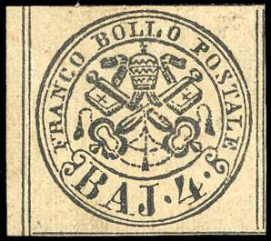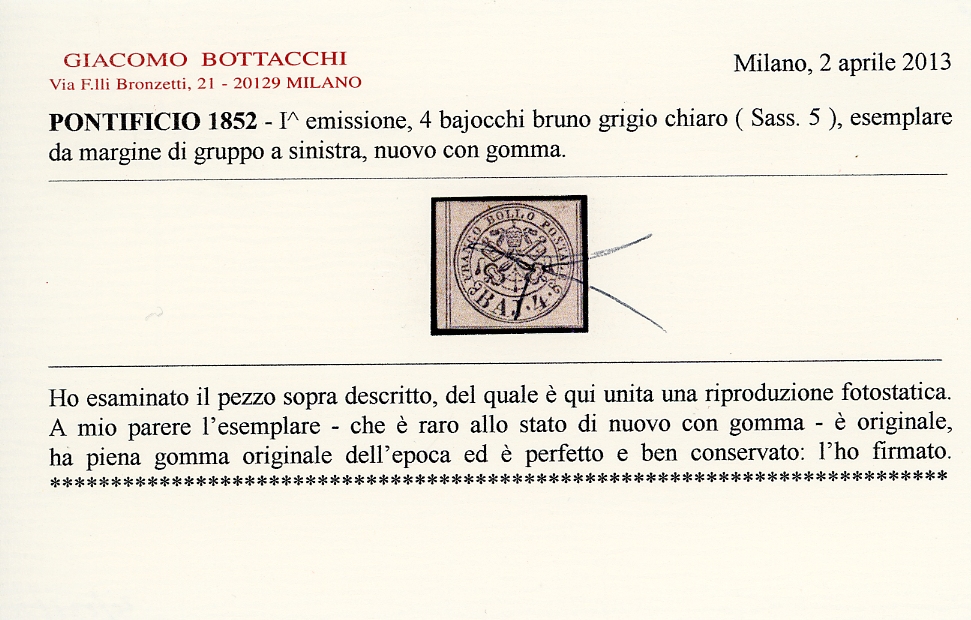 1852 - 4 baj bruno grigio (5), nuovo, gomma originale, margine di gruppo a sinistra, perfetto. Splendido e raro. A.Diena, cert. Colla, Zanaria e Bottacchi.