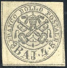1852 - 4 baj bruno grigio chiaro (5), nuovo senza gomma, perfetto. Chiavarello, cert. Ferrario. Ex coll. Imperato.