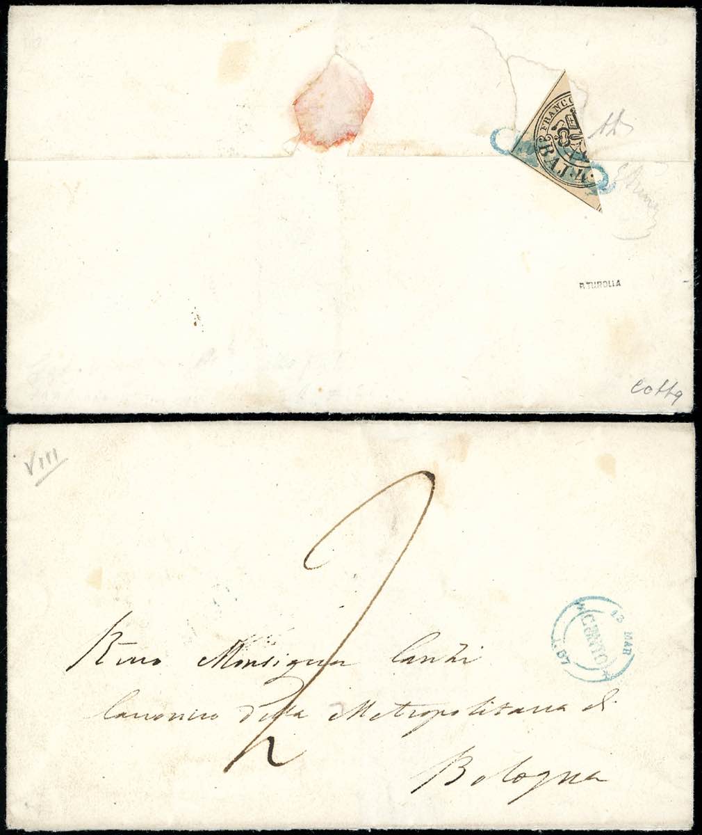 1857 - 4 baj bruno grigio chiaro, frazionato diagonalmente a metà (5), perfetto, al verso di sovracoperta di lettera in porto assegnato da Cento 13/3/1857 a Bologna. Em. ed A.Diena, cert. Colla.