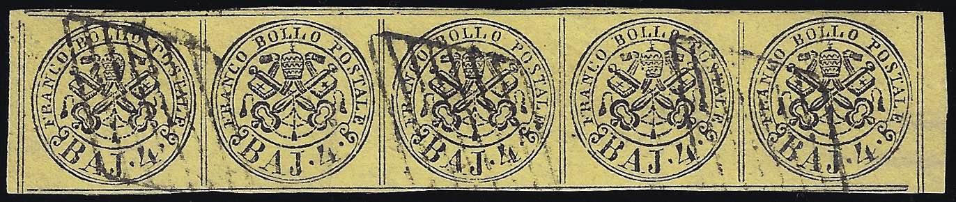 1864 - 4 baj giallo (5A), striscia orizzontale di cinque, usata, perfetta. Rara. A.Diena, Raybaudi, cert. E.Diena.