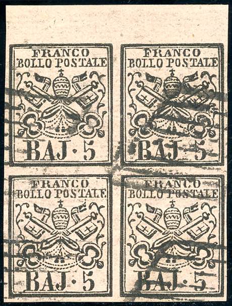 1852 - 5 baj rosa chiaro (6), blocco di quattro, bordo di foglio in alto, usato, perfetto. Molto Bello! A.Diena, Chiavarello. Ex coll. Imperato.