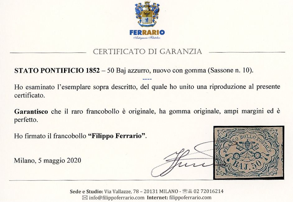 1852 - 50 baj azzurro (10), parte del francobollo adiacente a destra, ottimi margini, nuovo, gomma originale, perfetto. Splendido ed estremamente raro. Emilio ed Alberto Diena per esteso, cert. Ferrario.