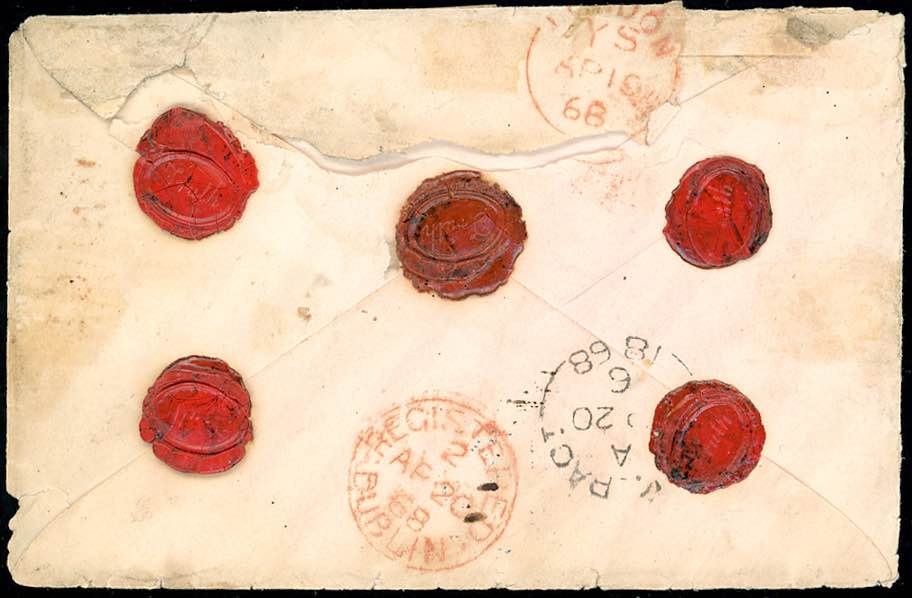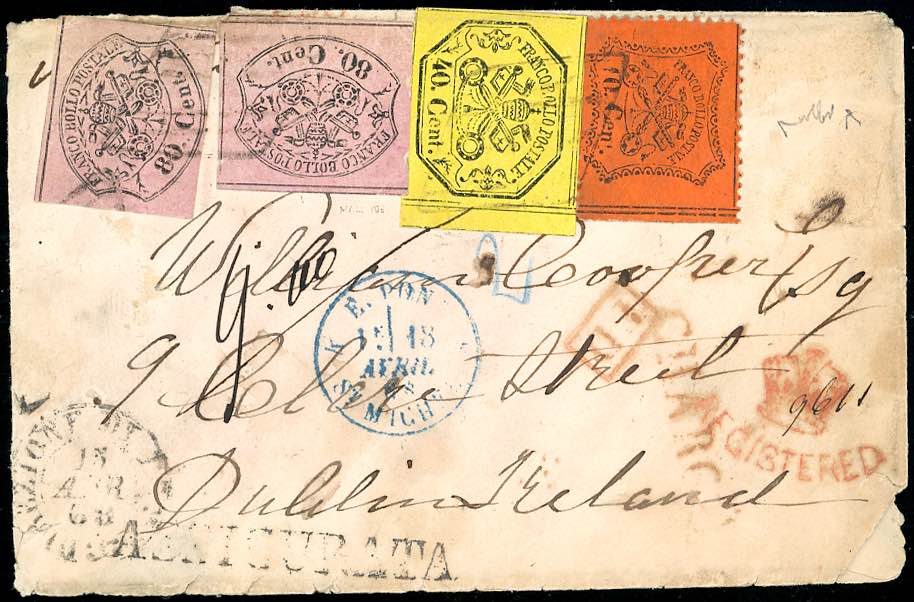 1868 - 80 cent. rosa lillaceo, due esemplari, 40 cent. giallo, 10 cent. arancio vermiglio (20,19,26), perfetti, un francobollo mancante da 10 cent., su busta assicurata da Roma 15/4/1868 a Dublino, Irlanda. Pregevole e non comune destinazione. Ex coll. Imperato. Cert. E.Diena.
