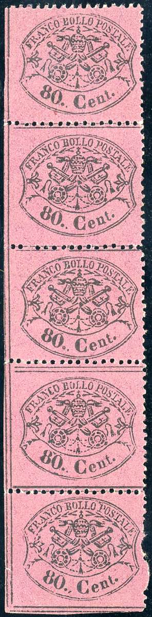 1868 - 80 cent. lilla rosso (31), striscia verticale di cinque, gomma originale, integra per i tre esemplari centrali, perfetta ad eccezione del francobollo in basso. A.Diena, Chiavarello. Ex coll. Imperato.