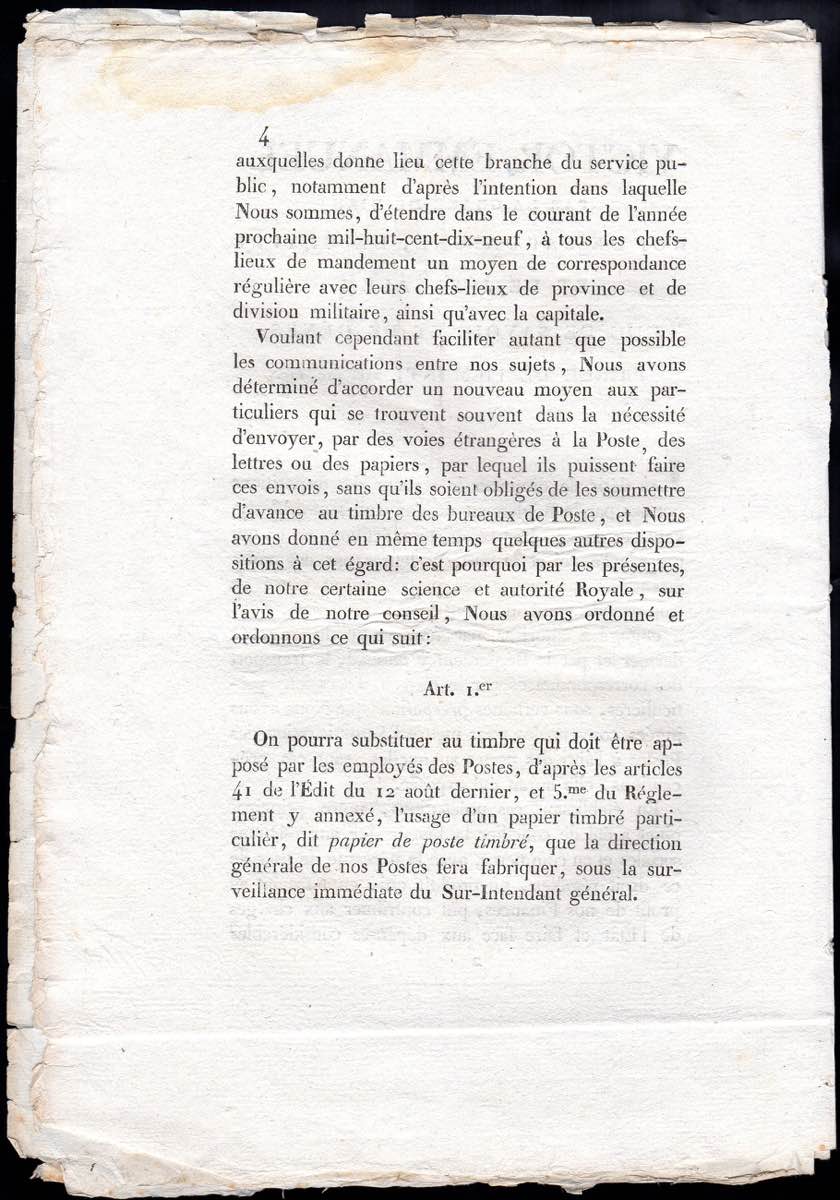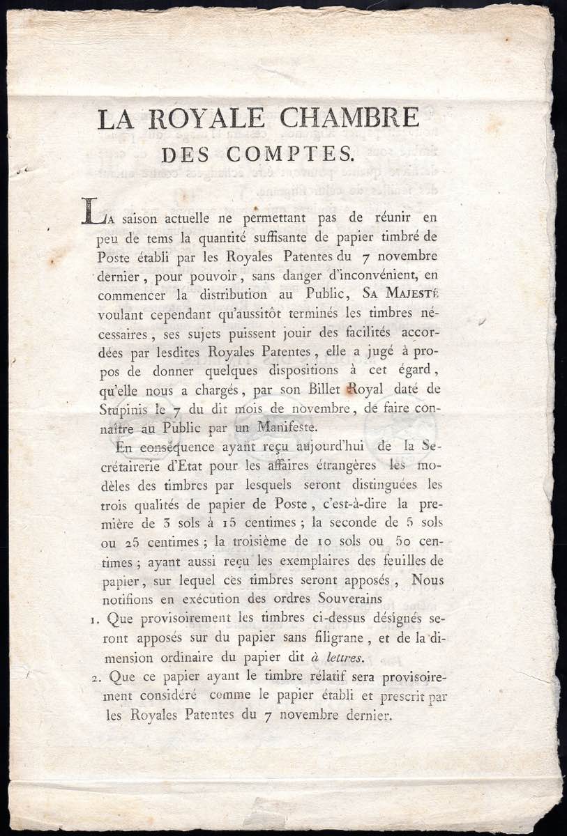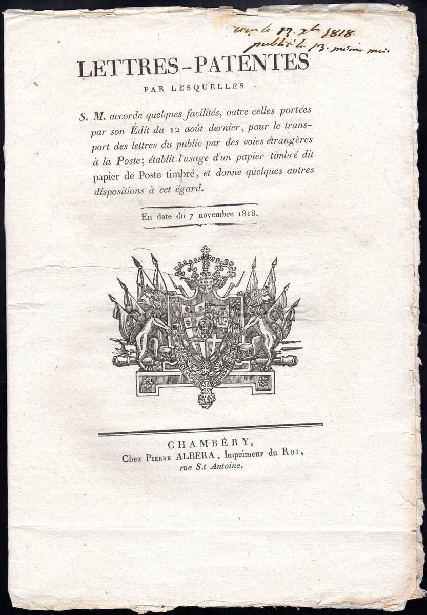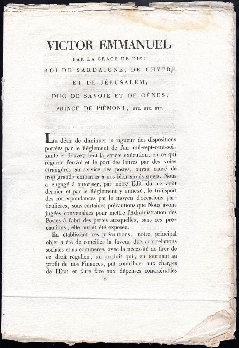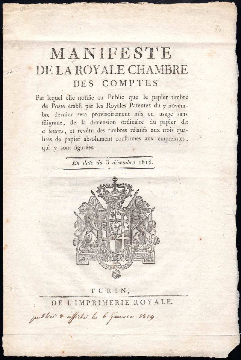 1818 - Manifesto camerale del 3/12/1812 in FRANCESE, con la riproduzione delle tre impronte a stampa dei Cavallini. Allegato il Regolamento del 7/11/1818 con le istruzioni per il servizio, sempre in francese. Raro insieme. Raybaudi. Ex coll. Imperato.