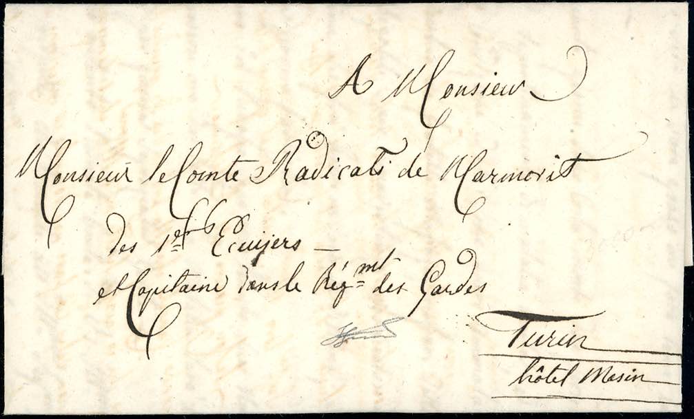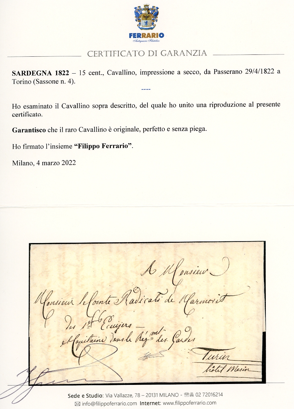 1822 - 15 cent. Cavallino, impressione a secco (4), perfetto e SENZA PIEGA, da Passerano 29/4/1822 a Torino. Splendido e raro! Cert. Ferrario.