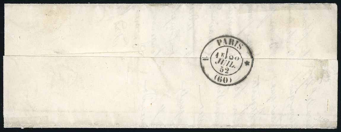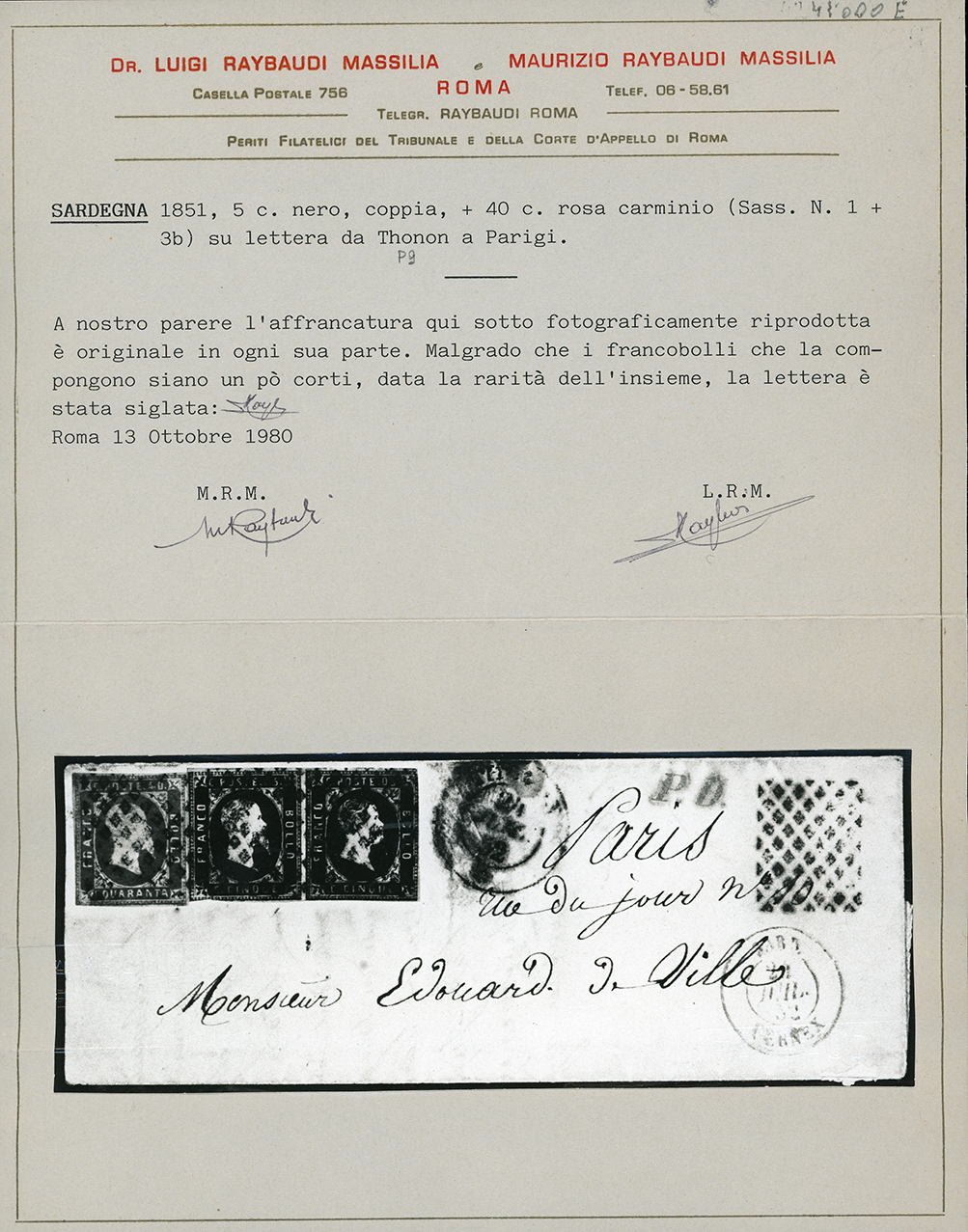 1852 - 5 cent. nero, coppia, 40 cent. rosa carminio vivo (1,3b), lievi difetti di marginatura, su sovracoperta di lettera da Thonon 24/7/1852 a Parigi. Rara e molto fresca, occasione! Cert. Raybaudi.