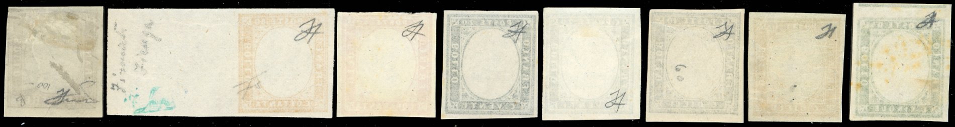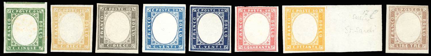 1855/63 - IV emissione, serie completa dal 5 cent. al 3 lire, il 10 cent. e il 20 cent. ripetuti in due tinte differenti, tutti senza effigie, gomma originale/integra, perfetti, lievi ossidazioni solo per il 5 cent. Rarissimo il 3 lire. Ottima qualità. Cert. Ferrario.
