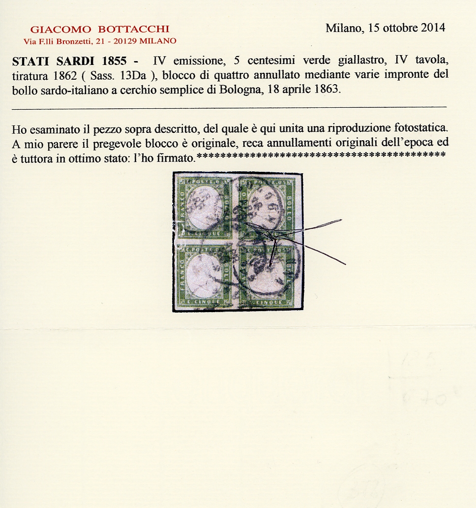 1862 - 5 cent. verde giallastro (13Da), blocco di quattro, perfetto, usato a Bologna 18/4/1863. Cert. Bottacchi.