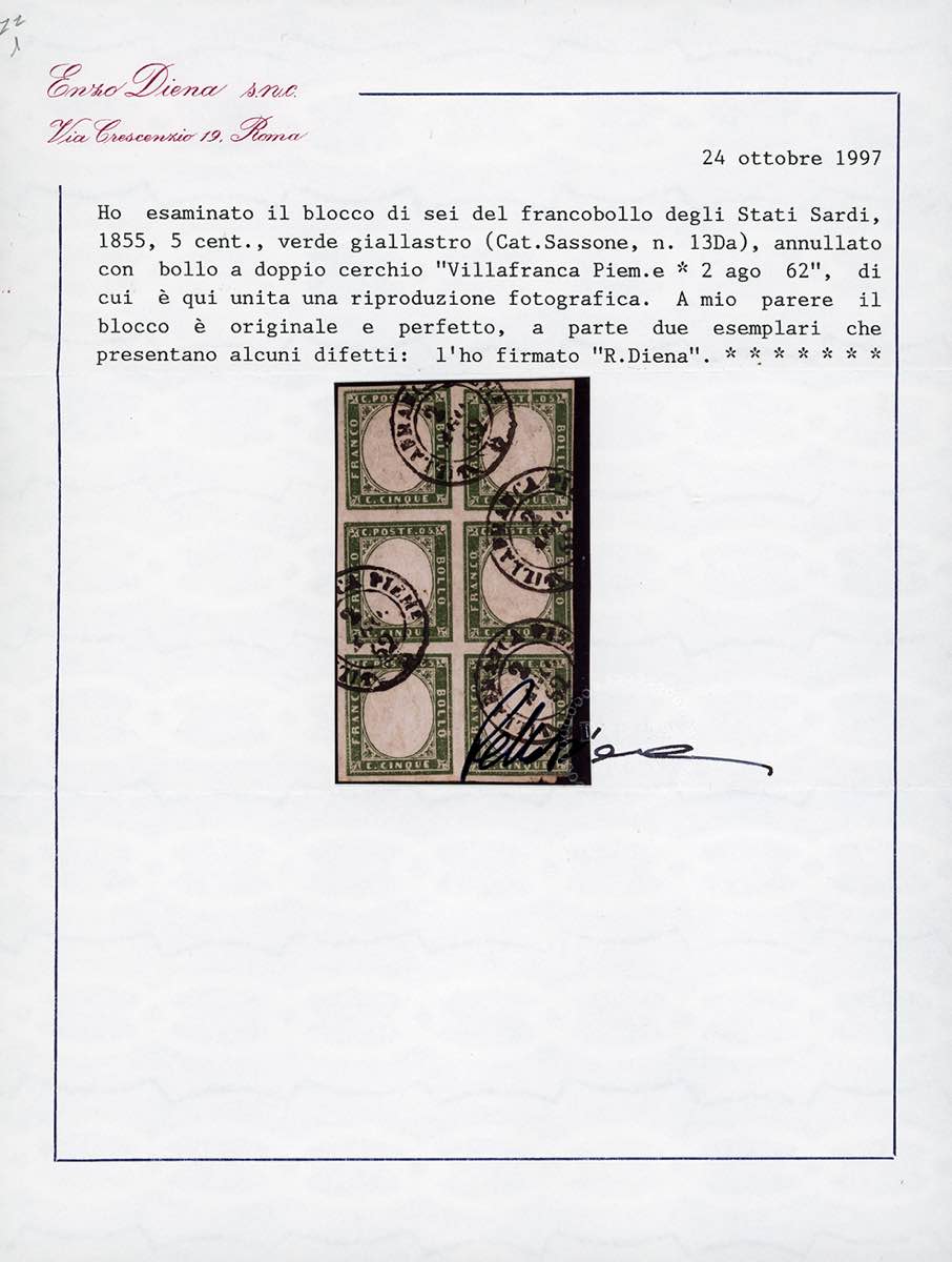 1862 - 5 cent. verde giallastro (13Da), blocco di sei, due esemplari difettosi, usato a Villafranca Piemontese 2/8/1862. Raro! Cert. Diena.