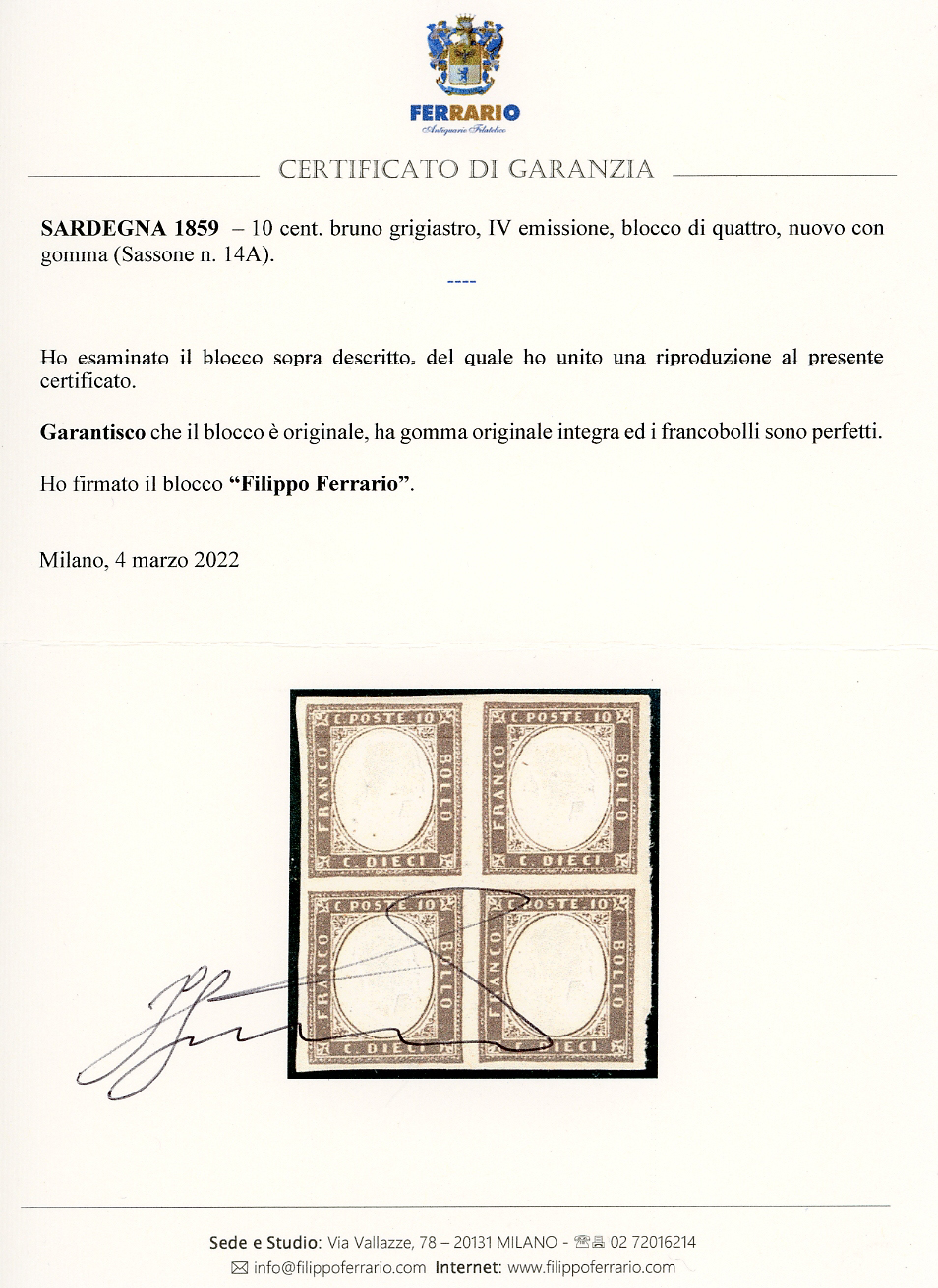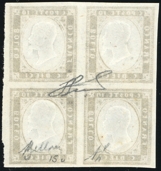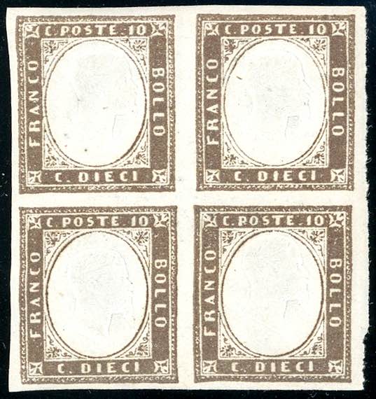 1859 - 10 cent. bruno grigiastro (14A), blocco di quattro, gomma originale integra, perfetto. Molto fresco. A.Diena, cert. Ferrario.