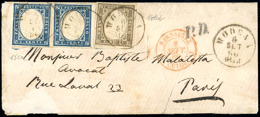 1860 - 10 cent. bruno chiaro rosaceo, 20 cent. azzurro, coppia (14Ad,15Ca), buono stato, su lettera da Modena 5/9/1860 per Parigi, Francia.