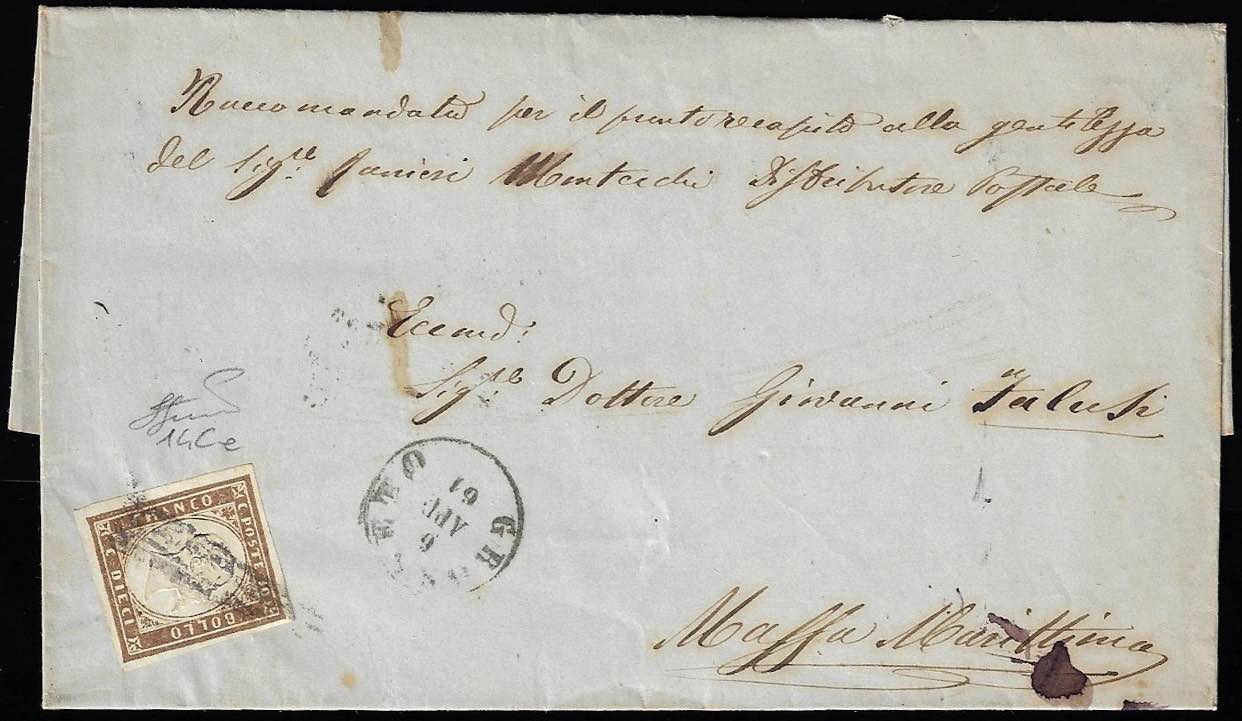 1861 - 10 cent. bruno cioccolato scuro (14Ce), perfetto, su sovracoperta di lettera da Grosseto 6/4/1861 a Massa Marittima. Cert. Ferrario.