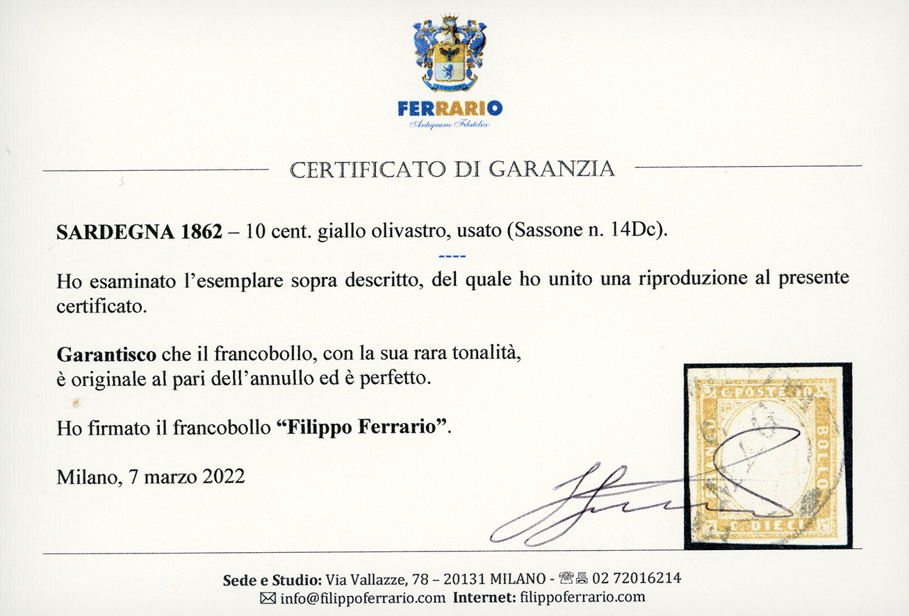 1862 - 10 cent. giallo olivastro (14Dc), usato, perfetto. Rara tonalità, molto bello. Cert. Ferrario.