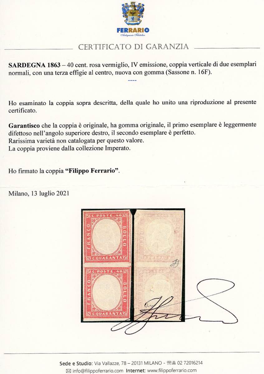 1863 - 40 cent. rosa vermiglio (16F), coppia verticale di due esemplari normali, con una terza effigie al centro, gomma originale, impercettibile traccia di linguella, il primo esemplare leggermente difettoso in un angolo. Rarissima varietà, non catalogata per questo valore. Chiavarello, Ex coll. Imperato. Cert. Ferrario.
