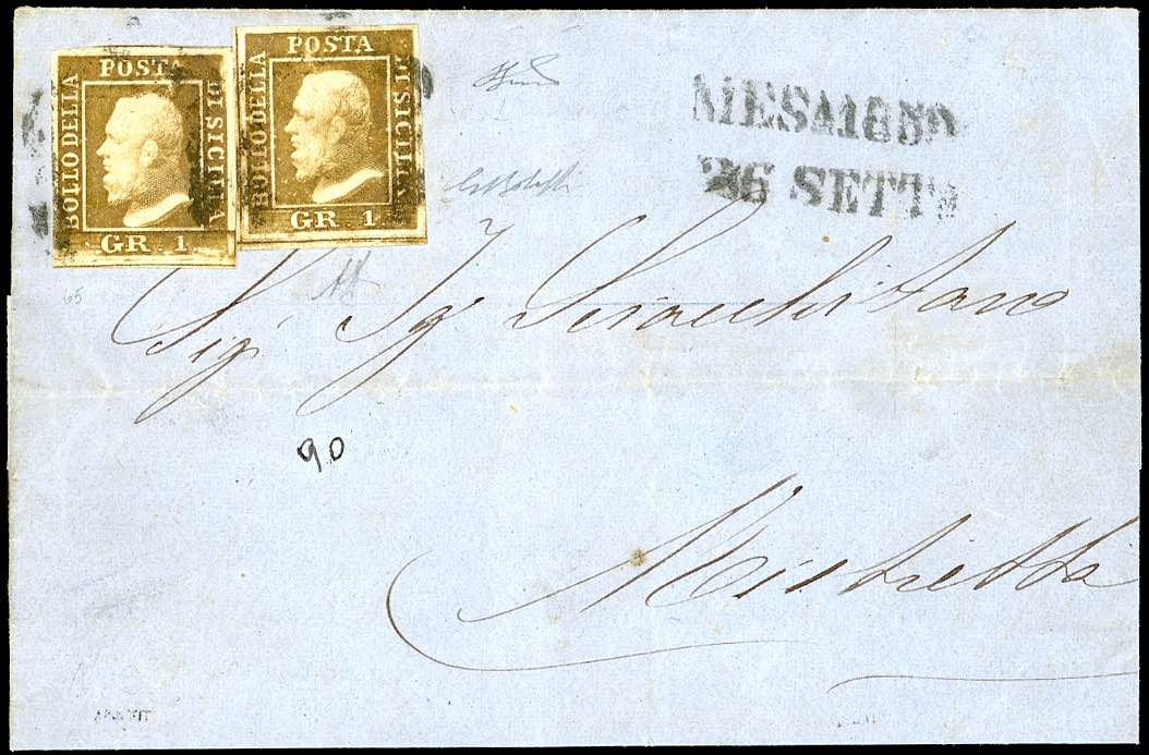 1859 - 1 grano bruno ruggine, I tavola (3), due esemplari, perfetti e ben marginati, su sovracoperta di lettera da Messina 26/9/1859 a Mistretta. Rara! G.Bolaffi, A.Diena, cert. Ferrario.