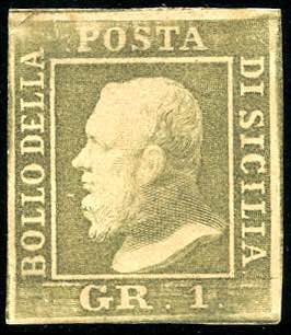 1859 - 1 grano bruno oliva, II tavola, carta di Napoli (4b), gomma originale, piccolo assottigliamento. Ottimo aspetto. Em. e A.Diena, Ferrario.