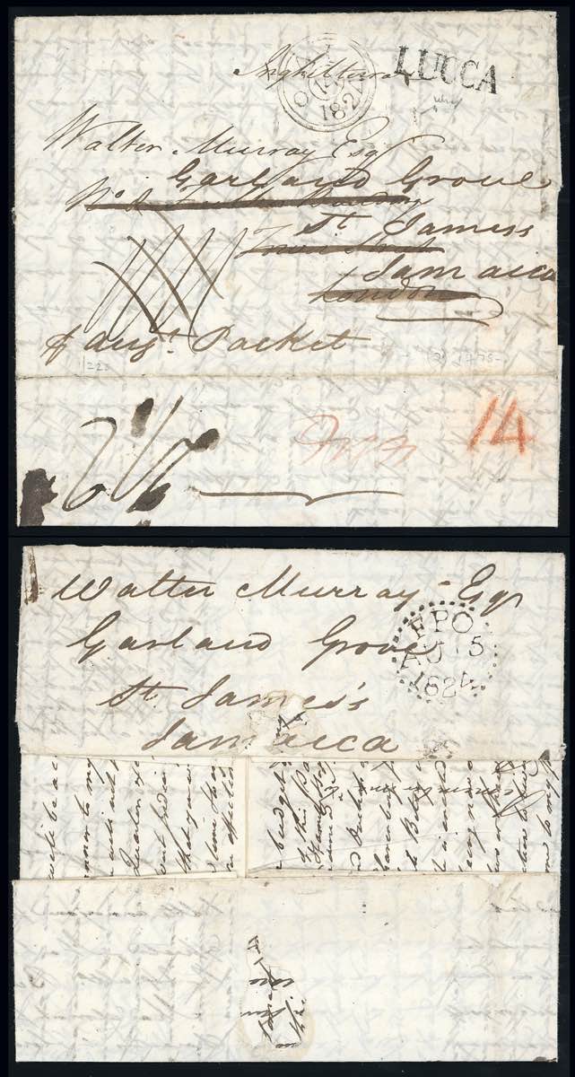 1824 - Lettera prefilatelica da Lucca 21/7/1824 inviata inizialmente a Londra, dove fu rispedita per la Giamaica tramite un forwarder, segni di tassazione al verso. Destinazione rarissima dal Granducato di Toscana, DUE SOLE LETTERE NOTE, entrambe non affrancate. Chiavarello. Ex coll. Imperato.
