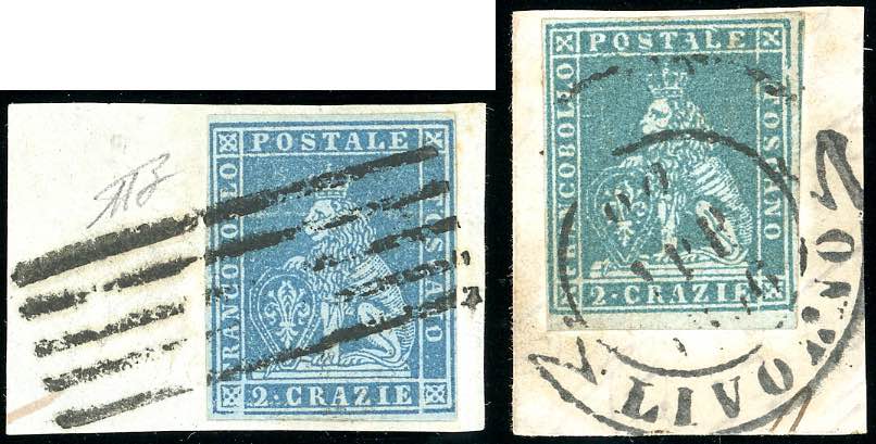 1851 - 2 crazie azzurro su grigio, 2 crazie azzurro verdastro su grigio (5d,5e), perfetti, usati su frammento. Ferrario.