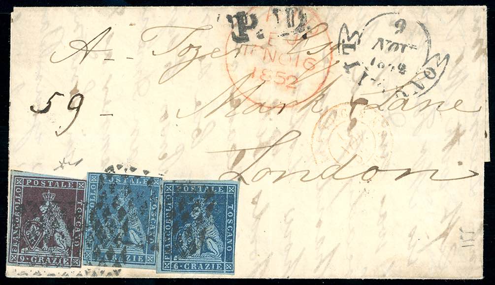 1852 - 2 crazie azzurro vivo, 6 crazie azzurro scuro, 9 crazie viola bruno scurissimo, tutti su carta azzurra (5b,7c,8a), lievi difetti di marginatura, su lettera da Livorno 9/11/1851 a Londra. Rara tricolore con tutti i francobolli su carta azzurra. Chiavarello. Ex coll. Imperato.