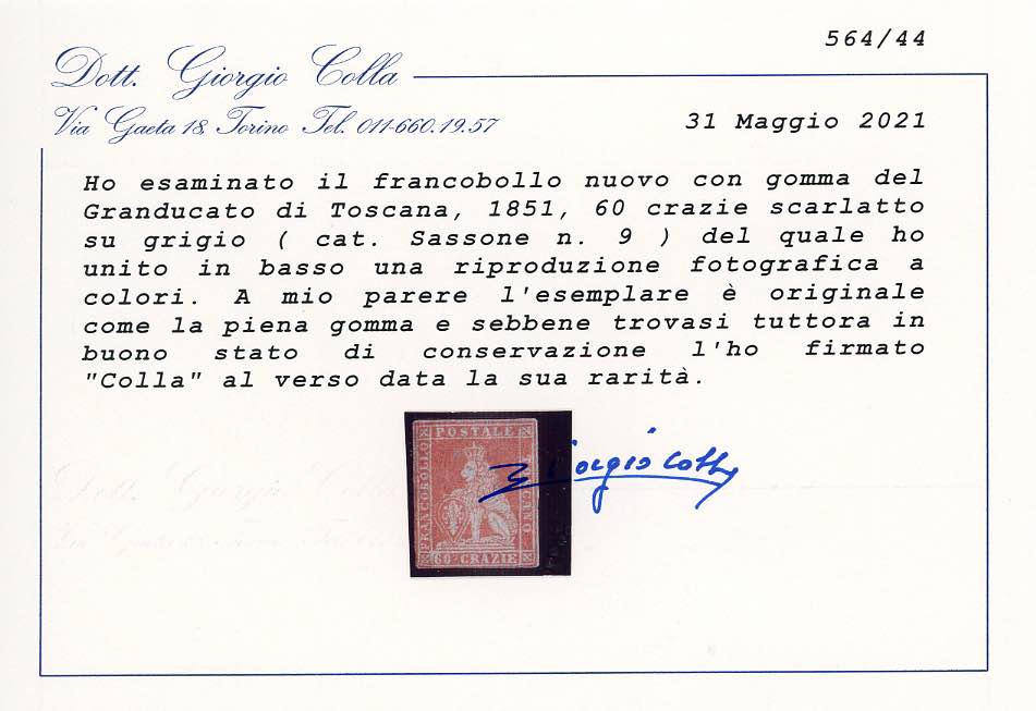 1860 - 60 crazie scarlatto su grigio (9), gomma originale, buono stato. Uno dei più rari francobolli allo stato di nuovo di tutti gli Antichi Stati Italiani. Occasione! Cert. Colla.