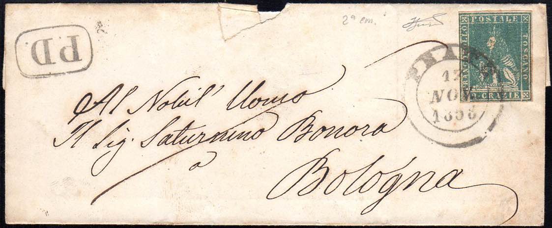 1858 - 2 crazie azzurro grigio verdastro, II emissione (13a), perfetto, su sovracoperta di lettera da Prato 17/11/1858 a Bologna. Pregevole ... Read more