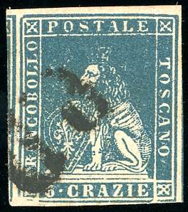 1857 - 6 crazie azzurro, II emissione, varietà di clichè (15), usato, perfetto. G.Oliva, Ferrario.