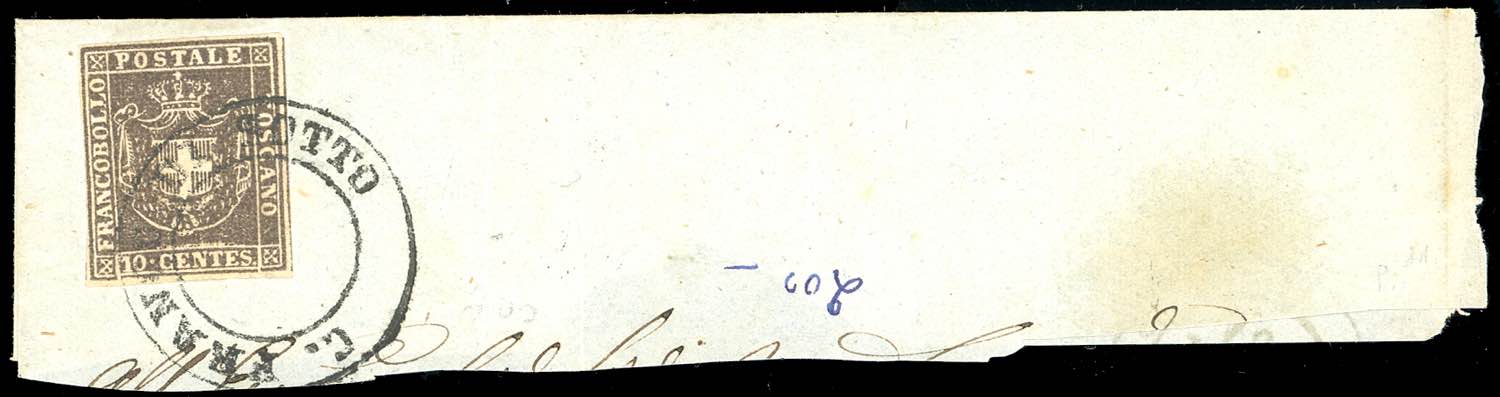 CASTELFRANCO DI SOTTO, punti 13 - 10 cent. (19), perfetto, usato su ampio frammento con il doppio cerchio grande senza data.