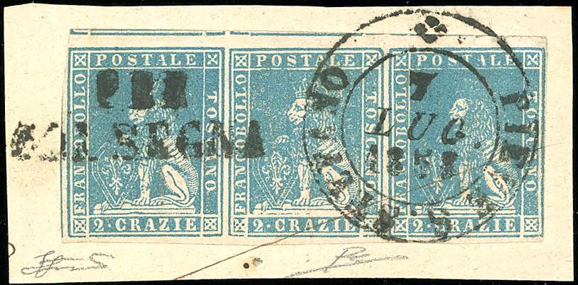 PIEVE S.STEFANO, doppio cerchio + per consegna punti 12 - 2 crazie (13), striscia orizzontale di tre, perfetta, interspazio di gruppo in alto, usata su frammento il 7/7/1858, datario capovolto. Insieme molto bello. R.Diena, Ferrario.