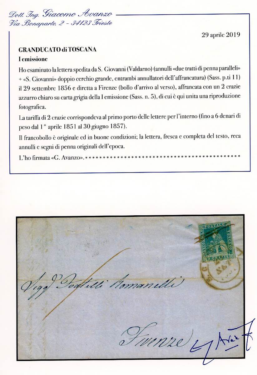 S. GIOVANNI, doppio cerchio grande + penna coannullatori punti 11 - 2 crazie (5), giusto in alto, su lettera del 29/9/1856 a Firenze. Combinazione di annulli ad oggi inedita! Cert. Avanzo.