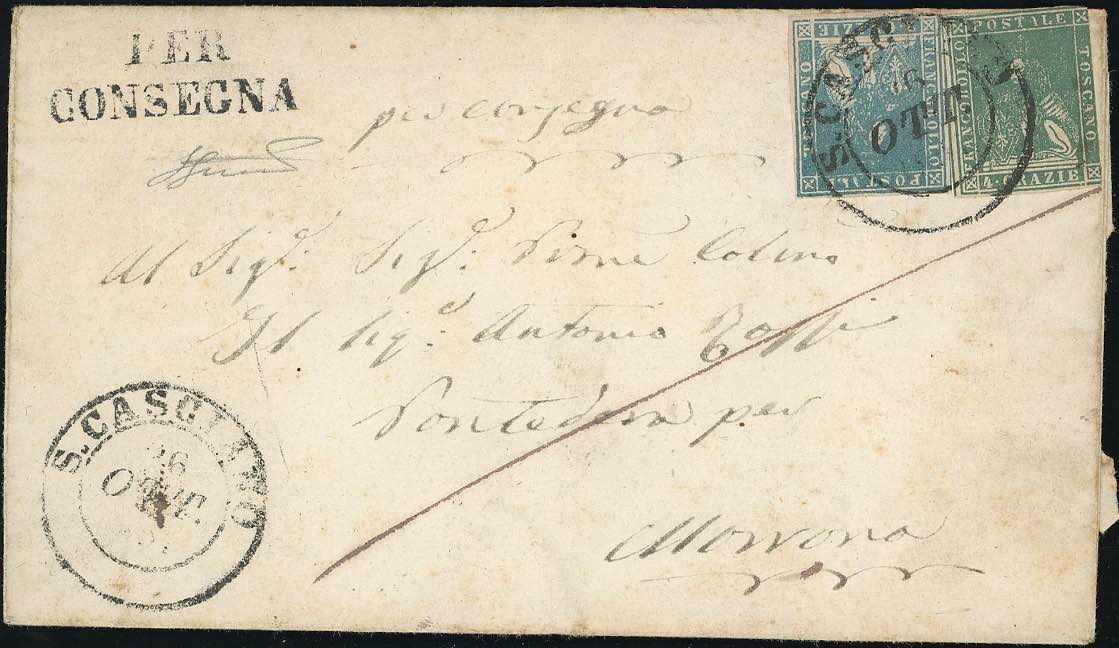 S.CASCIANO, PER CONSEGNA non catalogato - 2 crazie, perfetto, 4 crazie, difetti (13,14), su sovracoperta di lettera raccomandata del 26/10 per Morrona (Pontedera). UNICO ESEMPLARE NOTO DI QUESTO BOLLO DI RACCOMANDAZIONE, NON CATALOGATO DAL CATALOGO SASSONE, citato ma non riprodotto dal Bargagli. Cert. Ferrario.
